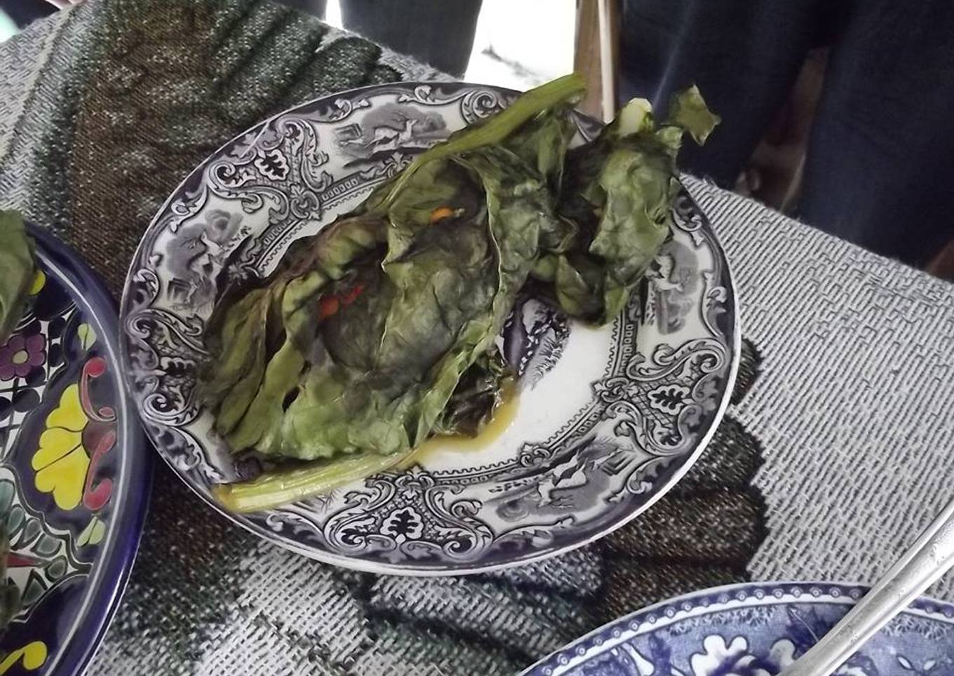 - Tomamos una hoja de acelga y sobre de ella ponemos dos piezas de pollo, envolvemos y agregar o ponemos otras dos hojas. Las acomodamos en una vaporera, las cocemos diez minutos a fuego bajo, apagamos y servir.