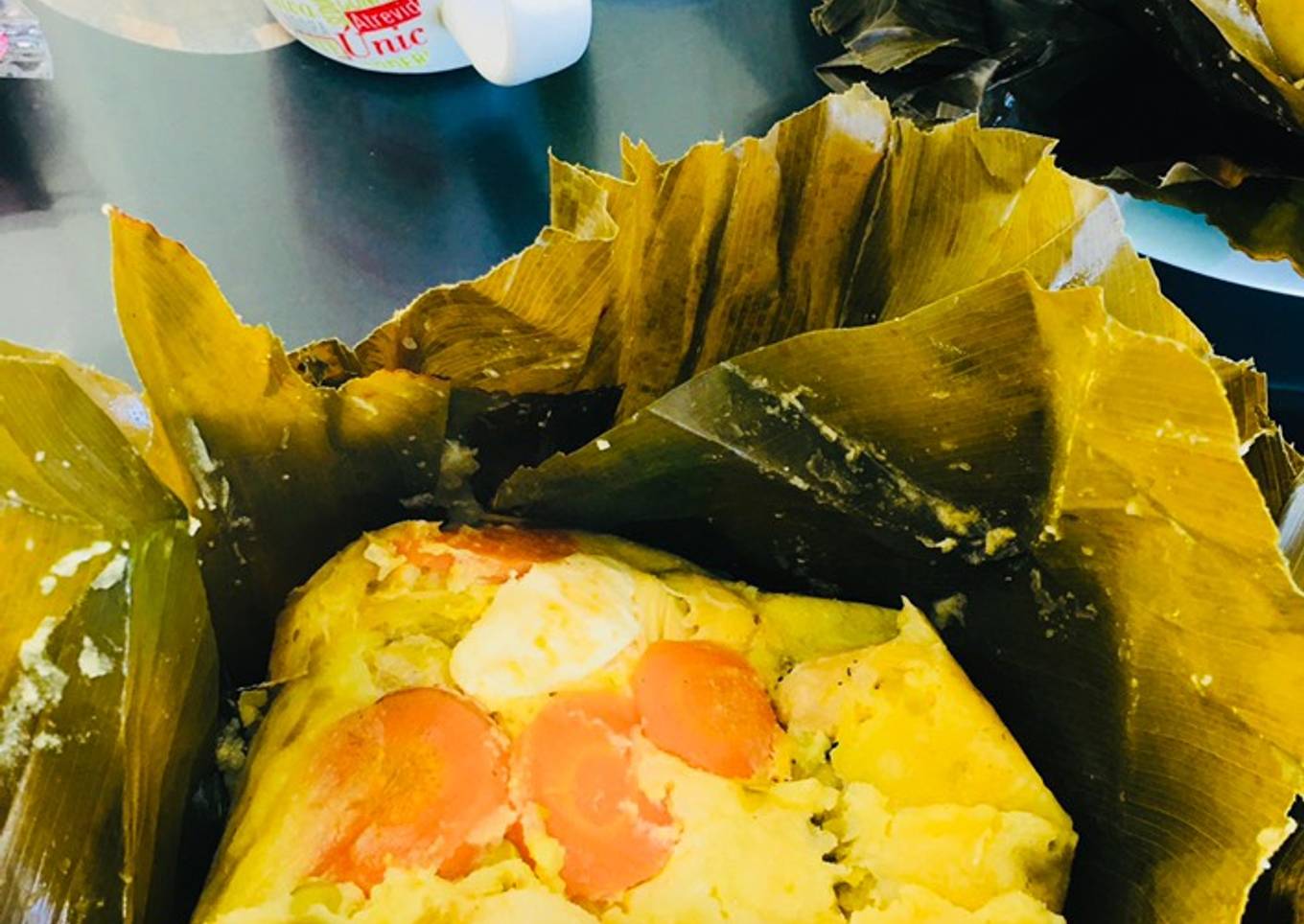 - Agregamos la mezcla a nuestras hojas, agregamos la presa, la carne, el tocino, el hueco cocido y las zanahorias en rodajas crudas, armamos en forma de regalo y las amarramos muy bien, deben cocinarse al vapor por una hora y listo dejamos reposar y a disfrutar..