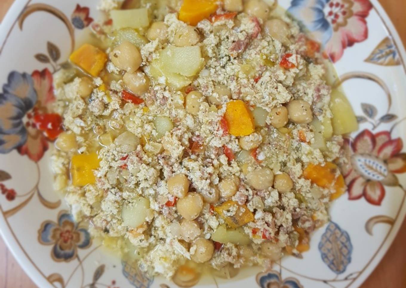 - Añadir la batata, la patata y los garbanzos. Cubrirlo con agua y cocinarlos a fuego medio-bajo 30 minutos tapado.