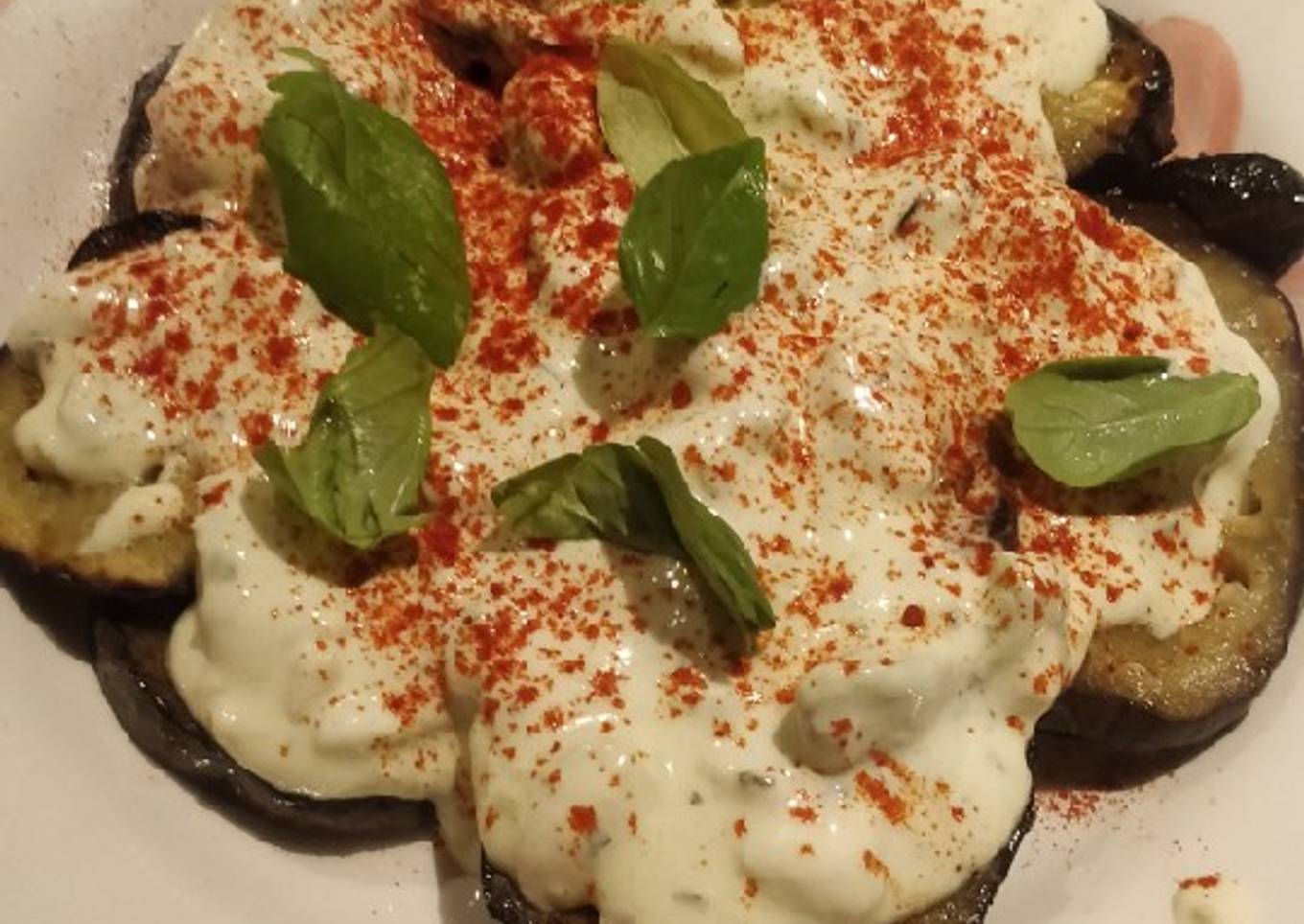 - Ponemos las rodajas de berenjena en un plato, añadimos la salsa de yogurt por encima, ponemos pimentón por encima y las hojas de albahaca.