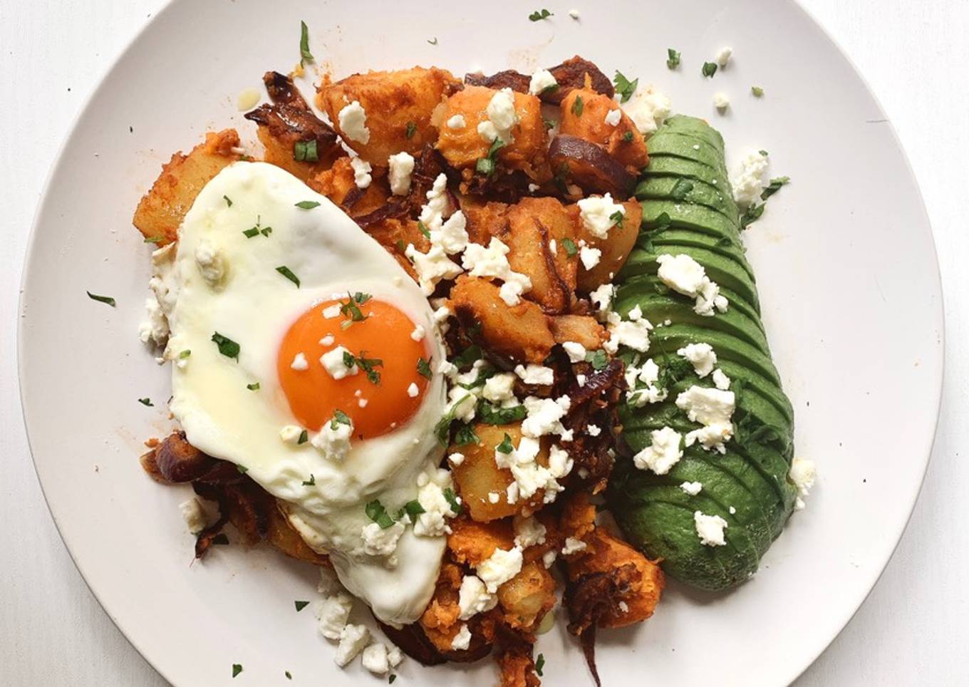 - Servir la mezcla de patatas con el huevo encima y el aguacate al lado. Espolvorear el queso feta y el cilantro picado.