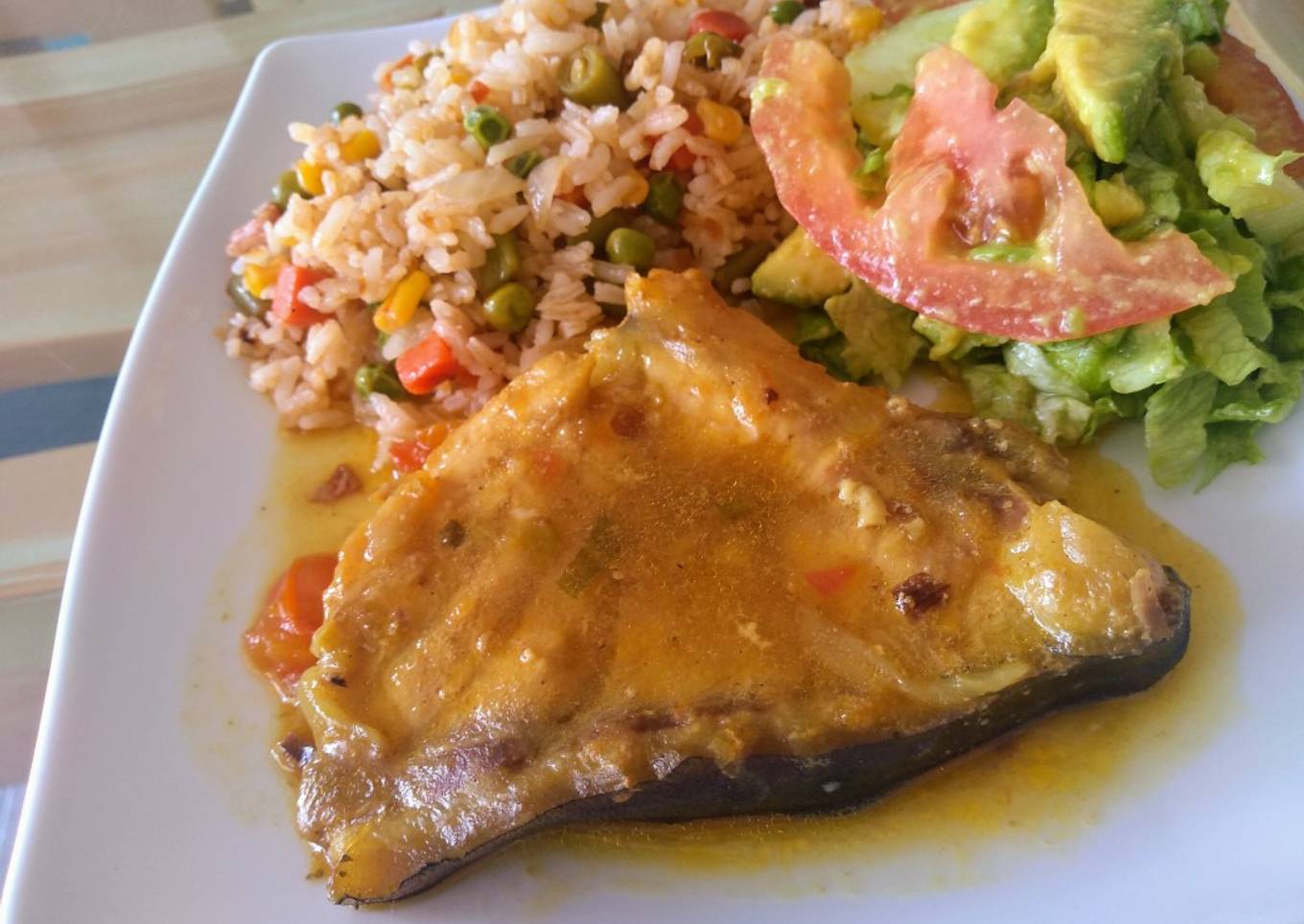 Pescado Amarillo en salsa y ensalada con aderezo de aguacate